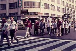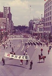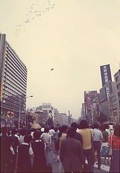 歩行者天国5.5 1973年6月10日 上野から銀座まで5,5Kmにわたる世界一長い歩行者天国が実現。 広小路にこれだけの人出ががあったのは、関東大震災時と、昭和5年の海と空の博覧会に次ぐ三度目のこと。 パレード 1973年7月 「世界ではじめて」 納涼歩行者天国を祝うパレードが挙行されました。 若き日の保坂三蔵・参議院議員 春日通り 騎馬警察隊も参加してのパレード ジャンボプロムナード55 と称してのパレード。 真ん中に深谷隆衆議院議員と保坂三蔵参議院議員 街の様子 ウ~ モウレツ!! 1974年7月 夏の納涼大会 期間中のイベントで中央通りにて 「綱渡り」が行われた。 1974年7月 土曜日の納涼で 袴越しでの「金魚すくい」 パレード 銀座でのイベントのひとコマ。 銀座でのイベントのひとコマ。 中央通りでのスタンプラリーイベント。