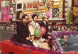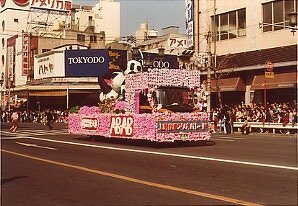 桜まつり 寛永寺が建立されると間もなく上野の山には桜の樹が植えられ、江戸随一の桜の名所となる。 しかし、昭和12年から始まった第2次世界大戦により上野の桜は荒廃した。 そこで上野観光連盟は昭和23年に桜1250本を植栽、東京都に寄贈した。 これを記念として今もなお桜祭りが開催されている。 1978年上野桜まつり大パレード 内山元区長とミス台東区 華やかな山車 当時は日中にパレードが行われていた