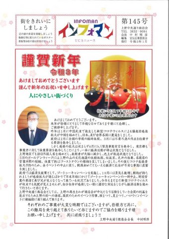 インフォマン第145号発行のお知らせ 2021.02.15 お知らせ 令和3年の新年号として、インフォマン第145号を発行いたしました。 下記リンクよりPDFでもご覧いただけます。 目次 インフォマン145号 商店会会長新年のご挨拶 第75期定時総会報告 パンダ花壇の植替え作業について 年末懇親会報告 ゴルフ会報告 青年部研修旅行について ホームページリニューアルのお知らせ